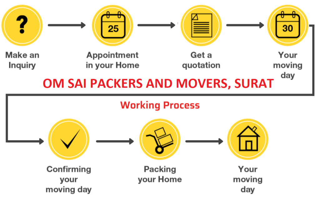 The process of Om Sai Packers and Movers follows a systematic seven-step approach.